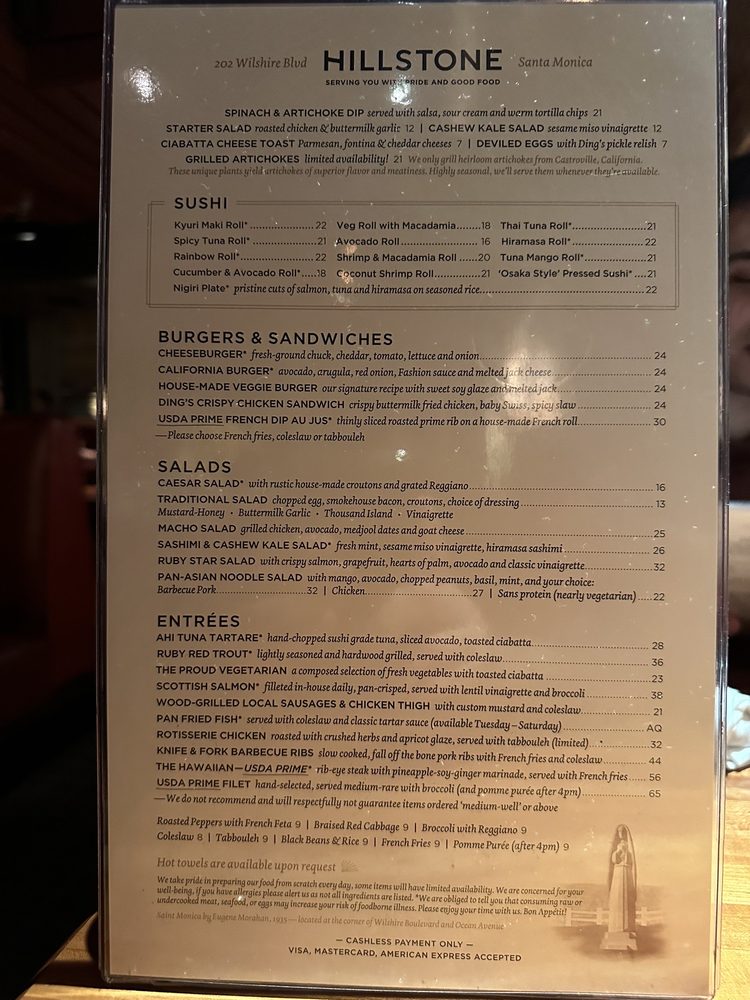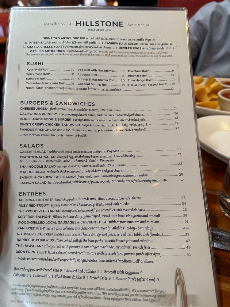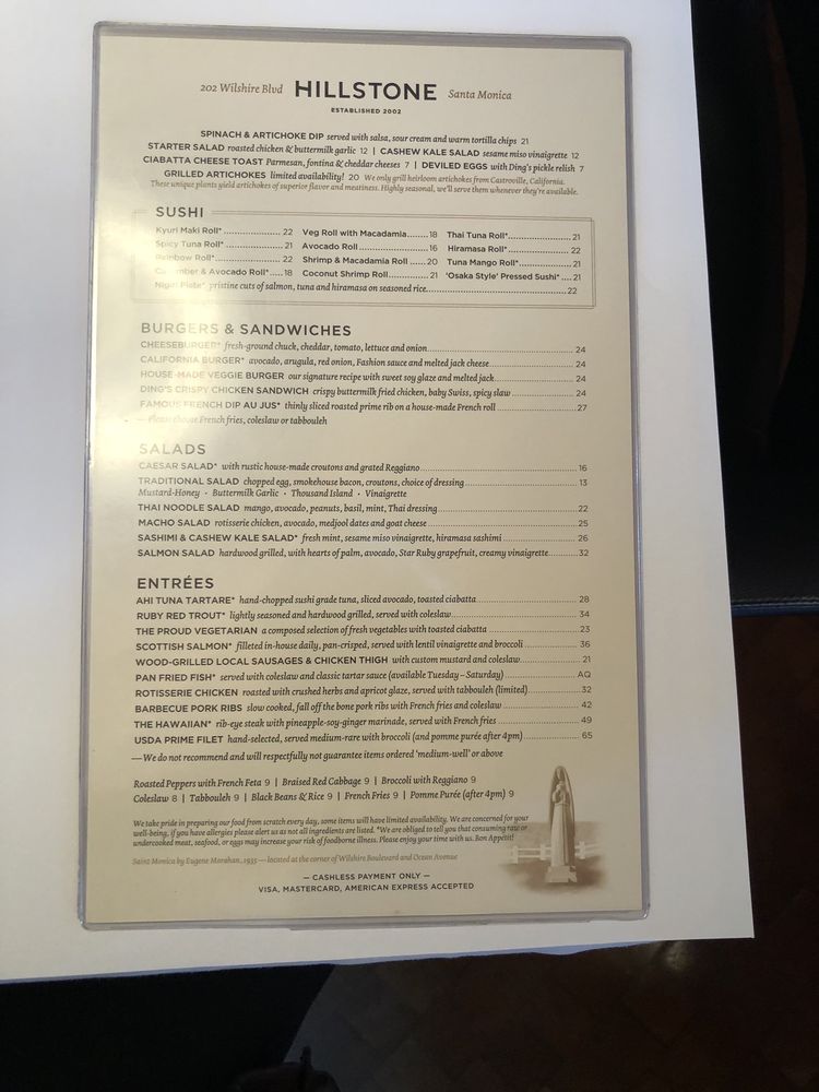 Located in Santa Monica, Hillstone offers a refined dining experience specializing in New American cuisine with a touch of sushi. With a classy ambiance and attentive service, this restaurant stands out for its quality meals. The menu features a variety of dishes, from the popular spinach artichoke dip to the mouth-watering wood-grilled local sausages & chicken thigh. The tuna tartare and baby back ribs receive high praise from regular customers, highlighting the consistent quality and flavorful options available. Despite some minor hiccups with orders, the overall dining experience at Hillstone is described as lively and enjoyable. Whether you're looking for a romantic dinner or a casual lunch, Hillstone's diverse menu and upscale atmosphere make it a standout choice in Santa Monica.